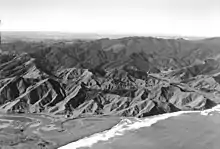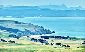 ![]() The north end of the Herangi Range viewed from Karioi; Taranaki Point in the near distance | |