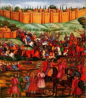 ![]() An illustration of the battle of Herat. The city's walls are clearly seen in the background. In this illustration, Nader's soldiers bring him prisoners and severed heads while Nader's soldiers finish off the Afghans and force them to flee. | |||||||||