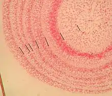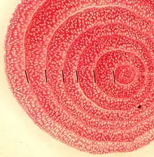 Annual growth rings in herbs are usually only visible by means of a microscope and a specific staining method. Ring-like patterns visible in root cross-sections by the naked eye may be "false rings".[9]