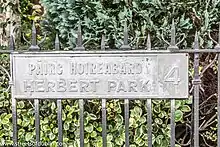 The land used for the park was given to the city by the 14th Earl of Pembroke whose family name was Herbert.[1] In 1907, the World Fair known as the Irish International Exhibition was held in Ballsbridge. When the structures had been dismantled, the site was developed as the current public park, with the bandstand and pond being the only remaining structures from the time. It is now maintained by Dublin City Council.[2] The former site of the Johnston, Mooney & O'Brien bakery bordered the park and when that site was redeveloped as the Herbert Park Hotel,[3] a new entrance was opened at the easternmost end of the park.