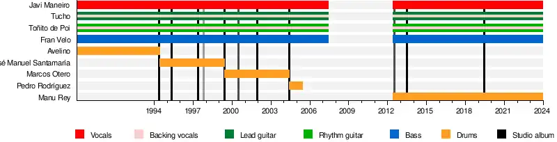 | Members | Singer: Francisco Javier Vázquez Maneiro Jarfuxo, O Fillo da necha Main guitar: Antonio Novo Suárez, Tuchiño. Second guitar:Antonio Ageitos Ares Tonhito de Poi Bass: Francisco Javier Velo Cambeiro O Jran Fran Drum: Avelino (1991–1994) José Manuel Santamaría Medín (1994–1999) Marcos Otero (1999–2004) Pedro Rodríguez Trelles (2004–2005) |