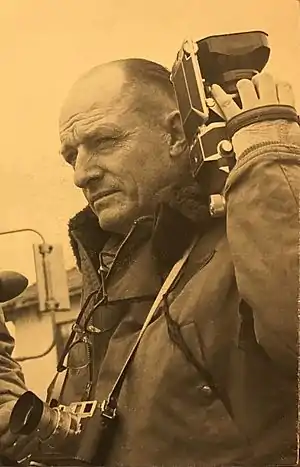 Though severely injured, Wall held onto his 35mm Leica camera. His tenacity very well may have been the thing that kept him alive, along with his khaki uniform sealing his wounds.[5] In the pre-operative tent, Wall spoke with the medical officer, Captain Joseph Aprile, who was attempting to save his life, saying the film from his camera needed to get back to headquarters. Finally being assured this would happen, he released the film. The Army Pictorial Service in London received, processed and distributed these photos, the greatest number of pictures released by a single photographer on D-Day.[6][7][8]
