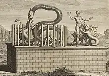 [T]hey saw a tower or tower-like structure, squared, made of stone and whitewashed, with stairs; [...]. Atop sat a large idol with two lions or tigers which seemed to devour the idol by the flanks, and a serpent or animal of over 40 feet long and as wide as a thick ox which swallowed a fierce lion; all stone very well carved. Everything was awash in the blood of men who had been executed or sacrificed there.