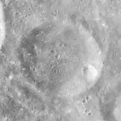 This formation is an undistinguished, circular crater. The interior floor is relatively flat and featureless. There is a tiny craterlet along the eastern rim that has a slightly higher albedo than the remainder of the crater.