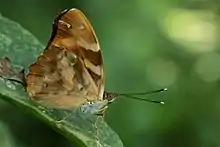 It is fairly common up to 4000 ft (1200 m) in the Sikkim-Darjeeling area. Most frequent between 2000 and 3000 ft (600–900 m). It is very fond of over-ripe fruits. Visits damp patches for puddling. According to Haribal (1992), when disturbed it sits with head down and wings close to tree trunks and thus perfectly camouflaged. Very difficult to catch/locate in this stage. Haribal (1992) saw it in Chungthang and Mangan area of Sikkim.