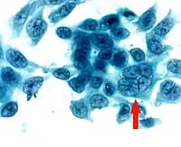Impression cytology smear stained by Papanicolaou stain shows the presence of a multinucleated giant cell