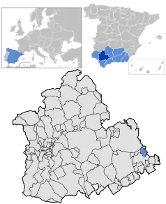 Herrera is a Spanish municipality located in the province of Seville, in Andalusia. It has a population of 6484 (as of 2018) and an area of 53,48 km². It is 120 km from the provincial capital, Seville. It is located at a crossroad in the geographical center of Andalusia, less than an hour from provincial capitals such as Córdoba, Málaga and Seville, and just over an hour from Granada. Its name is derived from a Latin inscriptions on the shield: Populus (village), Natus (born), Ignique (fire), Ferro (and iron).