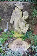 A 1.54 m × 0.72 m (5.1 ft × 2.4 ft) sculpture of William and Caroline, named Star Gazers by Vivien Moudell, sits against the garden wall close to the entrance to the workshop. Made of Bath stone and slate, it was unveiled in 1988 by Patrick Moore and Rod Davies. It shows William dressed in a wig, jacket and ruffled shirt, behind Caroline, in a bonnet and holding a quill pen, looking at a piece of paper showing a drawing of the solar system with Uranus at the centre. An octagonal slate panel was set above their heads, engraved with planetary orbits.[8][27][28]