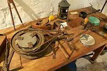 William built a single-storey workshop at the rear of the basement, extending into the garden; he used the workshop to conduct experiments and to construct his lenses, and it still contains Herschel's treadle lathe.[4] The workshop, adjacent to the kitchen, was where William and Alexander made their telescopes. It contains a replica furnace, and a replica of William's machine for polishing lenses, the original of which is in the Science Museum, London;[14] the replica polishing machine has been designed to be handled,[3] and a touchscreen computer demonstrates the tools and machinery in the workshop.[15]
