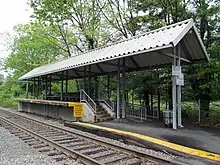 The Needham cutoff opened on November 4, 1906, from West Roxbury to Needham Junction, allowing trains from the former New York and New England Railroad to reach Boston without needing to use the New York Central's Highland branch.[1] Building the cutoff required a significant length of difficult rock cuts - "one of the heaviest pieces of short railroad construction ever attempted in New England" - reaching a depth of 57 feet (17 m) at Great Plain Avenue.[4] Needham Junction was originally the only stop on the cutoff; Bird's Hill opened as an infill station at Great Plains Avenue in 1917.[1][5]