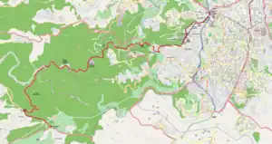 It then begins a slow northeasterly ascent as it passes Jerusalem's main electrical substation (Sapir Station)[3] and the Sataf Spring Nature Reserve.[4] Turning more easterly, it enters Jerusalem just before passing below Hadassah Hospital and intersects with Route 395 at Kerem Junction. It continues its ascent via Ein Kerem Street through the neighborhood of Ein Kerem travelling southeast, then north, then east until Holland Square adjacent to the Bayit VeGan neighborhood. From this point, Route 386 becomes a boulevard with traffic light controlled intersections.