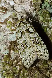 The larvae of this species feed on the callus tissue generated by their host trees as a result of damage caused by other insects including Aenetus virescens.[8][6] The larvae are believed to facilitate the development of rot in beech trees by keeping wounds open to the air.[15] Larvae are fully developed by October.[6] The species pupates at their feeding site and have been observed emerging in December.[8][6] The adult moths have been observed on the wing all year round but are most frequently seen from September to April.[16][13] This moth is a night flier and is attracted to light.[8] During the day the adult moths rest on tree trunks where their variable lichen mimicking colouration assists with their camouflage.[8] W. P. Cohen stated that he collected his specimens during the day while they were at rest on the trunks of weeping-willows.[9]