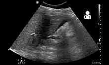 | Ultrasound showing a heterotopic pregnancy (intrauterine + extrauterine pregnancies) with signs that the extrauterine (ectopic) pregnancy has ruptured.[1] | |