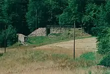 The northeastern flank was guarded by a 2.6-metre-wide, 3.5-metre-high and 110-metre long wall made of sandstone. This was in turn protected by a 3.5-metre-wide berm and a shallow ditch The wall on the inner side of the pincer gateway is only of single-leaf construction. The outer wall either side of the gateway approach on the hillside, was 2 metres wide and continued as a 55-metre-long wooden defensive breastwork. This probably enclosed the entire site. The gateway had a 1-metre-wide portal at the rear with a projecting wooden tower.