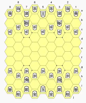 Hexshogi has the same types and numbers of pieces as shogi, and all normal shogi rules apply, including a similar initial setup (see diagram), drops, promotion, check, checkmate, and impasse. As in shogi, pieces capture the same as they move. But the hexagonal geometry implies special move patterns for the pieces.