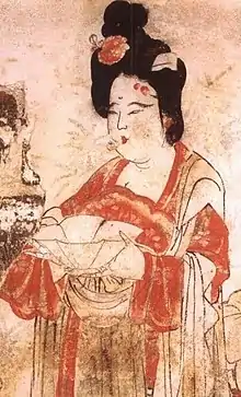 According to the Ming dynasty record, the Tang dynasty hezi is tied from the back to the front, and the lower part has a tie that the waistband of the qun (Chinese skirts) can be tied at the same time.[2] It is suggested that the Tang dynasty hezi wrapped the breasts and the back areas of women.[4] However, to date, there is a lack of unearthed archaeological artifact of the hezi dating from the Tang dynasty.[2] The painting "Court Ladies Adorning Their Hair with Flowers" by the 8th century painter, Zhou Fang, of the Tang dynasty was used as the main reference to recover the heziqun nowadays.