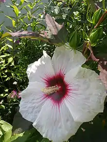 Hibiscus 'Kopper King' is a cultivar of Hibiscus that has large, showy flowers and copper-colored lobed leaves. It was bred and selected for its aesthetic attributes as well as its cold hardiness to at least −30 °F (−34 °C) (USDA hardiness zone 4) by Jim, Bob, and Dave Fleming of Fleming's Flower Fields in Lincoln, Nebraska. 'Kopper King' is a compact perennial shrub, reaching 3–4 ft (0.9–1.2 m) tall with a 2–4 ft (0.6–1.2 m) spread. The leaves are coppery red to dark purple, with a lobed and toothed leaf shape that appears to be similar to some maples. New growth will emerge in late May or early June and the plant will bloom from midsummer to early fall at the first frost. Each flower, with its cream to light-pink petals and deep red eye in the center streaking outward toward the margin, is borne singly from the leaf axils and can be 8–12 in (20.3–30.5 cm) in diameter. Each flower only lasts one day but new blooms are typically produced in succession, allowing for almost continuous flowering. The flower display is flat with petals overlapping. Overall, the plant is resistant to pests and diseases, although it can be severely damaged by Japanese beetles.[1][2]