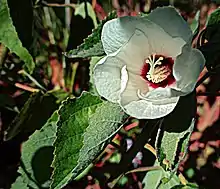 Hibiscus lasiocarpos (also, H. lasiocarpus orth. var.) is a species of hibiscus known by the common name hairy-fruited hibiscus. It is also one of several hibiscus called rosemallow.[2] It is native to much of the southeastern United States, as well as parts of California and northern Mexico. It is a large, bushy perennial herb with sprawling stems reaching one to two meters long. The leaves are heart-shaped, toothed, and pointed, and generally between 6 and 10 centimeters long. The inflorescence holds large showy, solitary flowers. Each flower has a cup of partly fused sepals beneath a layer of slender bracts. These may be covered in hairs or woolly fibers. The flower's large petals may be up to 10 centimeters long and are generally bright white with red bases. The stamen tube and anthers are white or cream. The fruit is a capsule 2.5–3 centimeters long containing spherical seeds.[3]