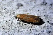 The wingspan is 20–30 mm with the forewings being blackish, variably overlain with reddish and whitish scales.[1] The hindwings of the common form are blackish with orange streaks.[1] This species is variable in appearance with some specimens having a rich reddish brown forewings without markings.[1][5] There is a form with hindwing markings that are whitish in thin stripes from the base of the hindwing.[1]
