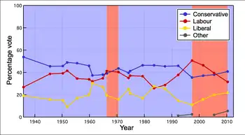 Since the 1966 general election, the seat has been somewhat of a bellwether, with only three exceptions: at the February and October 1974 general elections the seat was won by the Conservative Party when the Labour Party won the most seats nationally, and at the 2017 general election when the seat was won by Labour but the Conservatives won the most seats nationally.
