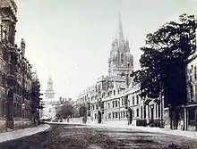 19th century photograph of the High Street looking west with University College on the left and the spires of the University Church of St Mary the Virgin and All Saints Church in the distance.