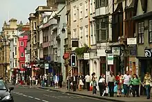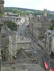 The street has been described by Nikolaus Pevsner as "one of the world's great streets".[2] It forms a gentle curve and is the subject of many prints, paintings, photographs, etc. The looking west towards Carfax with University College on the left and The Queen's College on the right is an especially popular view. There are many historical buildings on the street, including the University of Oxford buildings and colleges.[3] Locally the street is often known as "The High".