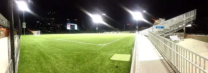 Highmark Stadium is a 5,000-seat soccer-specific stadium in Pittsburgh's Station Square which is home to Pittsburgh Riverhounds SC of the USL Championship and the Pittsburgh Thunderbirds of the American Ultimate Disc League. The stadium was also home to the Pittsburgh Rebellion women's football team for 2017. Three local colleges use the stadium for soccer, lacrosse and rugby, and six different local high schools will use the field for soccer and lacrosse.[6] The $10.2 million project began with the demolishing and excavating of the former Trib Total Media Amphitheatre, building foundations for the scoreboard, light poles and grading foundations for the grandstands as well as the installation of underground utilities. The field surface is FIFA 2-star certified artificial turf, the highest rating that an artificial surface can achieve, one of only six fields in the country to earn that rating.[6][7] Other fields to earn this rating in the United States include: Providence Park, CenturyLink Field, and Gillette Stadium, all of which house Major League Soccer franchises.[8][9][10]
