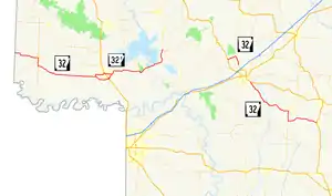 Highway 32 (AR 32, Ark. 32, and Hwy. 32) is a designation for three state highways in South Arkansas. One route of 34.22 miles (55.07 km) runs from Oklahoma State Highway 3 (SH-3) at the Oklahoma state line east to Highway 355 at Saratoga.[2][3] A second route of 3.96 miles (6.37 km) begins near Hope Municipal Airport and runs through Oakhaven to Highway 29.[4] A third segment of 18.87 miles (30.37 km) begins at US 278 and runs east to US 371 in Willisville.[5]