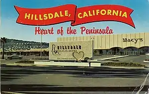 Developer David D. Bohannon acquired 848 acres (343 ha) from Burleigh H. Murray in the Beresford (later called Hillsdale) neighborhood in 1939-40[1] and began developing the area, starting construction on the Andrew Williams Grocery Store at the corner of Hillsdale Boulevard and El Camino Real in 1941.[1][2] Sears selected the Hillsdale site for one of its earliest suburban stores in 1948, and the Hillsdale Shopping Center master plan was completed in 1952;[2] Bohannon was reportedly inspired by the recently completed Westlake Shopping Center in Daly City.[3] In December 1954, Hillsdale Shopping Center opened as an open-air center,[4] featuring Sears (completed in 1949)[5] and the first suburban branch store of Macy's San Francisco,[6] later adding Emporium in 1962. Sculptures by Benny Bufano were commissioned for the mall in the 1950s. By 1970, Hillsdale had more than 150 stores.[1] Through the 1960s and 70s, Hillsdale Shopping Center marked the northern end of a popular Friday night cruise route along El Camino Real for young drivers.[7]