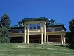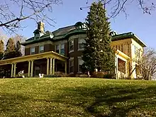 The 2½-story mansion is a brick structure built on a limestone foundation. It follows a rectangular plan that features projecting semicircular bays or rectangular pavilions at the corners on the east and west sides. The home features a porte-cochere on the north side and porches on the east and west sides of the building. There is a porch that faces the south side that runs the length of the house whose floors are of hand-made mosaic tile. There is also a two-level projecting pavilion; the upper part of which was enclosed in the 1920s. The front columns are 30 feet (9 m) in height and feature fluted Ionic capitals. All of the secondary columns on the house are 15 feet (5 m) high.[4] The structure is capped by a decked hipped roof with roof dormers that feature semicircular pediments above round arch windows. At the roofline is a copper cornice. The interior of the home features many of original architectural features, which include stained glass, three fireplaces, tapestry walls, pocket doors, and mahogany woodwork. The house is situated on a corner lot at the top of a bluff with a commanding view of the river.