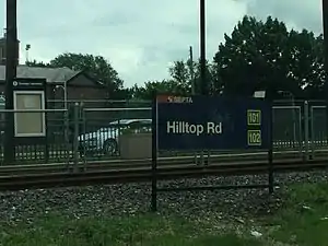 Hilltop Road is SEPTA Media-Sharon Hill Trolley Line station in Upper Darby Township, Pennsylvania. It is officially located at Garrett Road and Hilltop Road, but also includes Bywood Avenue as it parallels the north side of the line. The station serves both Routes 101 and 102, and only local service is provided on both lines. The station contains two platforms with plexiglass bus-type shelters on both sides of the tracks, both of which are at the far end of each platform. The Beverly Hills Middle School is across from the south side of the station along Hilltop Road.[1]