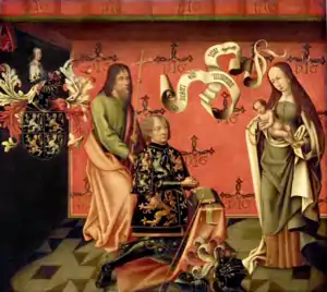A portrait of Philip Hinckaert (kneeling). In the background the wall is diapered in the Hinckaert knot.