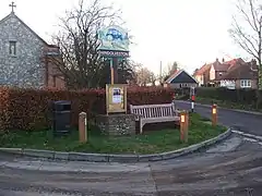 Saint George’s parish church was built in 1932[5] to replace an earlier church which stood on the edge of the village. The old church had become unusable when the tower collapsed in August 1892. The church has a 1930s style and is the work of a local builder called Jonathan Beckett to a design by the Diocesan architect, Herbert Green, which had been prepared at the turn of the 20th century. These plans, which had been drawn soon after the collapse of the old church, were adapted in the 1930s and have produced a church with a mixture of architectural features such as brick buttresses and lancet windows. Material was rescued from the old church and has been included in the new one including the old church font with vandalised panels, but not re-cut which show the Crucifixion, Instruments of the Passion and a Holy Trinity symbol. Also salvaged at the time were some brass inscriptions and a fine figure brass for Edward and Margaret Hunt and their 14 children.