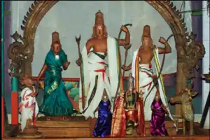 The twelve Alvars (saint poets of Vaishnava tradition) and sixty-three Nayanars (saint poets of Shaiva tradition) are regarded as exponents of the bhakti tradition of Hinduism in South India.[43] Most of them came from the Tamil region and the last of them lived in the 9th century CE. Composers of Tevaram – the Tamil saint poets of 7th century namely Appar, Tirugnana Sambandar and Sundarar with the 9th-century poet Manickavasagar, the composer of Tiruvacakam were saints of Shaivism. The Shaiva saints have revered 276 temples in Tevaram and most of them are in Tamil Nadu on both shores of river Cauvery. Vaippu Sthalangal are a set of 276 places having Shiva temples that were mentioned casually in the songs in Tevaram.[44] The child poet, Tirugnana Sambandar was involved in converting many people from Buddhism and Jainism to Hinduism. The saint Appar was involved in Uḻavatru padai, a cleaning and remodification initiative of dilapidated Shiva temples. The Alvars, the 12 Vaishnava saint poets of 7th-9th century composed the Divya Prabandha, a literary work praising god Vishnu in 4000 verses.