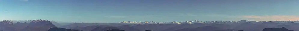 A panoramic view from the summit of the Hinteres Sonnwendjoch showing the Kaiser Mountains on the left, the High Tauern in the center and parts of the Zillertaler Alps on the right.