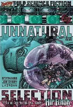 The character of Hip Flask first appeared in a number of advertisements for Comicraft comic book fonts in the late 1990s in which he was originally depicted as a private detective (this has since changed in the pages of his own comics). The character was created by Starkings when he failed to receive authorization from Marvel or DC Comics to use their characters in his Comicraft ads. He later graduated to his own series of one-shots by writers Richard Starkings, Joe Casey and artist Ladrönn.