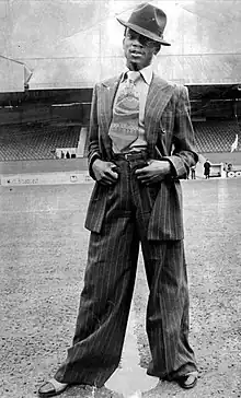 The zoot suit was the popular style amongst hepcats. It incorporated baggy blazer jackets with pants, bright colors, thick chalk stripes, floppy hats, and long chains. Many zoot suiters would often wear a fedora or pork pie hat, color-coordinated with the suit. Occasionally they would have a long feather on the fedora or pork pie hat as decoration.