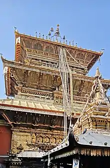 On the courtyard side the entrance is flanked by two golden elephants standing on tortoises. Above the door is a gilt copper torana. This torana was originally located at the main shrine, but was replaced there by a silver copy, donated during the reign of king Prithvi Bir Bikram Shah (1881-1911).[10]