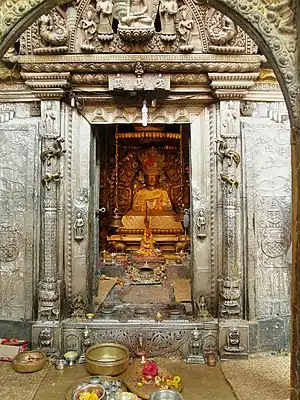 Above the door to the inner sanctum is a silver torana with reliefs of the Five Buddhas and Vajrasattva. It is a copy of the original gilt copper torana above the main entrance. There is a smaller, almost identical torana above the silver one.[4] Below the torana are images of Amitābha, Ratnasambhava and Amoghasiddhi.[10]