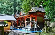 Like Kasuga Taisha, the main shrine consists of four Kasuga-zukuri sanctuaries in a single structure and is designated as a Tangible Cultural Property of Higashiōsaka.[5]