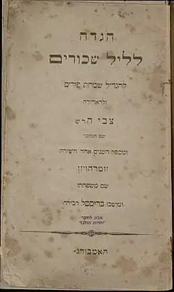 - Hagadah le-leil shikorim [Haggadah for the Night of Drunkards] (in Hebrew and Aramaic). Hamburg. 1842. A humorous parody of the Passover Haggadah for Purim.[3][13] Published in at least six editions by 1907, including one with a translation into Judeo-Arabic (Algeria, 1890).[14]