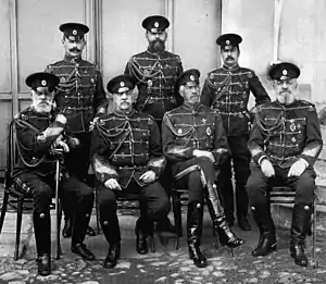 From left to right: Feofil Meyendorf, Illarion Vorontsov–Dashkov, Grand Duke Nikolai Nikolaevich the Younger, Sergei Vasilchikov are sitting; standing Vladimir Voeikov, Pavel Engalychev, Boris Petrovo–Solovovo