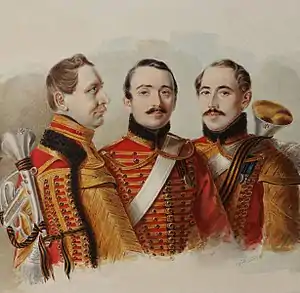 - ↑ Illustration 306. The Headquarters Officer of the Hussar Life Guards and the Chief Officer of the Life Guards of the Grodno Hussar Regiments. December 18, 1858 // Changes in the Uniforms and Armament of the Troops of the Russian Imperial Army Since the Accession to the Throne of the Sovereign Emperor Alexander Nikolaevich (with additions): Compiled by the Imperial Command / Compiled by Alexander II (Russian Emperor), Illustrations by Pyotr Balashov and Karl Piratskiy – Saint Petersburg: Military Printing House, 1857–1881 – Notebooks 1–111: (With Pictures No. 1–661) – 47×35 centimeters