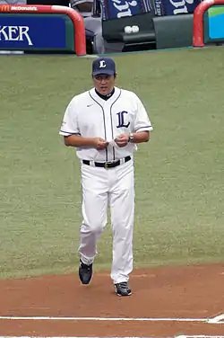 Hisanobu Watanabe (渡辺 久信 born August 2, 1965) nicknamed "Nabe-Q", is the former baseball player who played in the Japanese professional leagues from 1984 to 1998. He also was manager of the Saitama Seibu Lions for most of his pitching career with the Lions.
