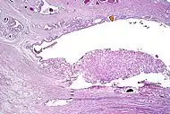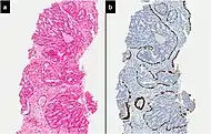 A histopathologic diagnosis of prostate cancer is the discernment of whether there is a cancer in the prostate, as well as specifying any subdiagnosis of prostate cancer if possible. The histopathologic subdiagnosis of prostate cancer has implications for the possibility and methodology of any subsequent Gleason scoring.[1] The most common histopathological subdiagnosis of prostate cancer is acinar adenocarcinoma, constituting 93% of prostate cancers.[2] The most common form of acinar adenocarcinoma, in turn, is "adenocarcinoma, not otherwise specified", also termed conventional, or usual acinar adenocarcinoma.[3]