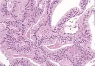• Large glands and papillary formations, lined by tall columnar cells, often pseudostratified[1]
