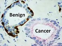 In uncertain cases, a diagnosis of malignancy can be excluded by immunohistochemical detection of basal cells (or confirmed by absence thereof),[4] such as using the PIN-4 cocktail of stains, which targets p63, CK-5, CK-14 and AMACR (latter also known as P504S).