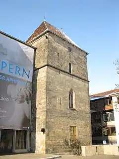 - The Tempelhaus (Temple House), a late-Gothic 14th-century patrician house, which today houses the tourist information office. The origin of the name is unknown. It might refer to a synagogue which was mentioned in a document written in 1385, as the house stands at the corner of a small street called "Judenstrasse" (Jews' Street).[10] In 1322, the street name Judenstrasse was mentioned in a document for the first time.[11] In the late Middle Ages, however, the Jews of Hildesheim lived in a quarter called Lappenberg which is another of the sights of Hildesheim, about one kilometer away from the Market Place. The Tempelhaus was remodelled several times, and in the 16th century the two round towers were added.[12] In 1591, a very impressive Renaissance bay window with colourful stone carvings was added to the Temple House. At the beginning of the war, the bay window was dismantled and hidden in a cellar. The house suffered some damage during the Second World War but was restored and inaugurated in 1950 after the bay window had been added again.