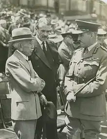 Defence issues became increasingly prominent in public affairs with the rise of fascism in Europe and militant Japan in Asia.[73] Prime Minister Lyons sent veteran World War I Prime Minister Billy Hughes to represent Australia at the 1932 League of Nations Assembly in Geneva and in 1934 Hughes became Minister for Health and Repatriation. Later Lyons appointed him Minister for External Affairs, however Hughes was forced to resign in 1935 after his book Australia and the War Today exposed a lack of preparation in Australia for what Hughes correctly supposed to be a coming war. Soon after, the Lyons government tripled the defence budget.[74] With Western Powers developing a policy of appeasement to try to satisfy the demands of Europe's new dictators without war, Prime Minister Lyons sailed for Britain in 1937 for the coronation of King George VI and Queen Elizabeth, en route conducting a diplomatic mission to Italy on behalf of the British Government, visiting Benito Mussolini with assurances of British friendship.[74]