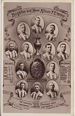 The club was first formed as Brighton & Hove United on 24 June 1901, and the name was quickly changed to Brighton & Hove Albion. The club took the place of a defunct club, Brighton & Hove Rangers, in the Southern League.[1] In the Southern League they won their only national honour to date, the FA Charity Shield, by defeating Football League Champions Aston Villa in 1910.[2] There had previously been Old Brightonians, representing the area in the FA Cup in the 19th century.